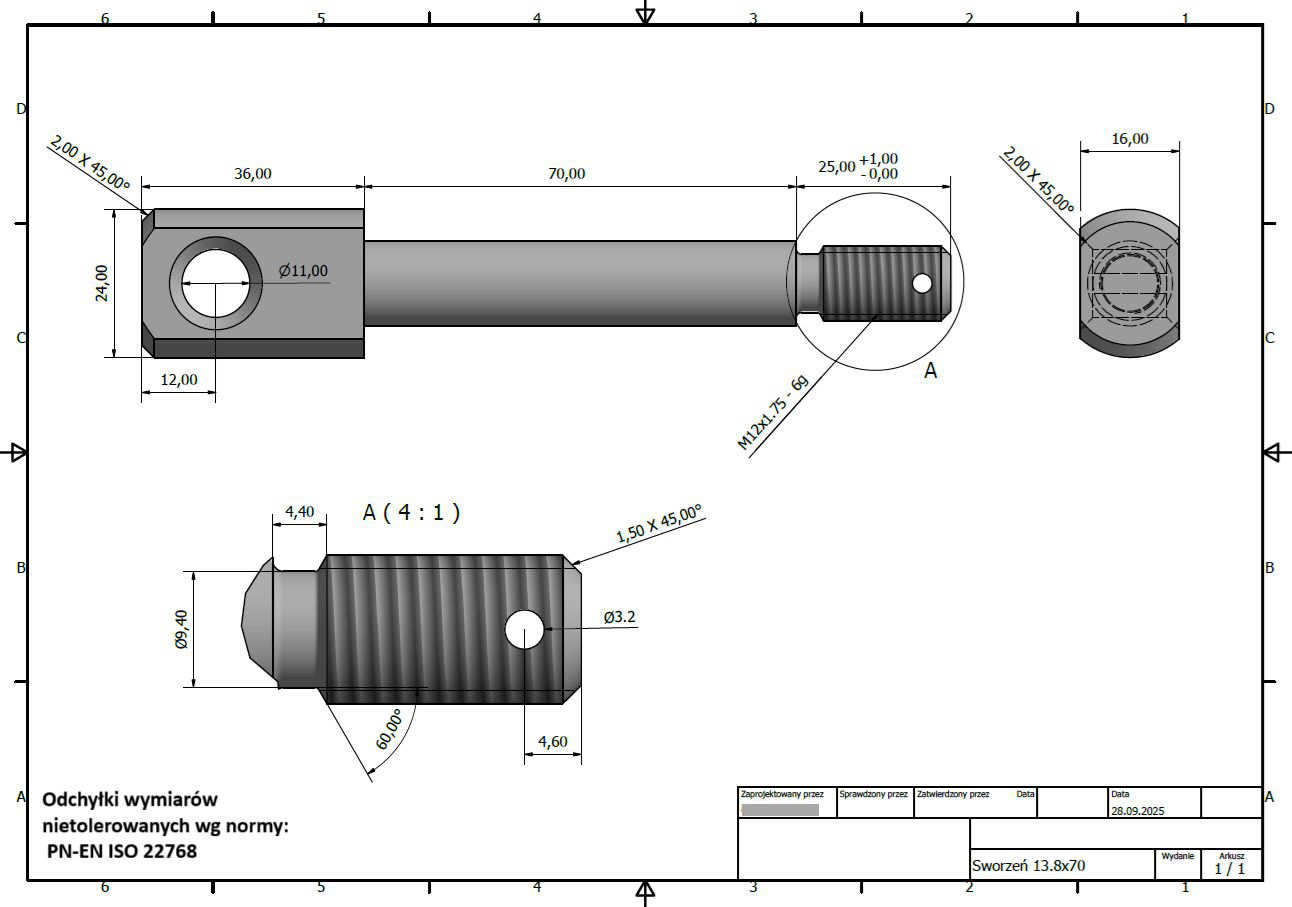 I am looking to commission the production of an element from S355 rolled bar. According to the drawing: link to the file . Material to be provided by the contractor. S355 rolled bar. The missing shank diameter over a length of 70 mm is 13.8 mm. Please quote for 1000 pcs.